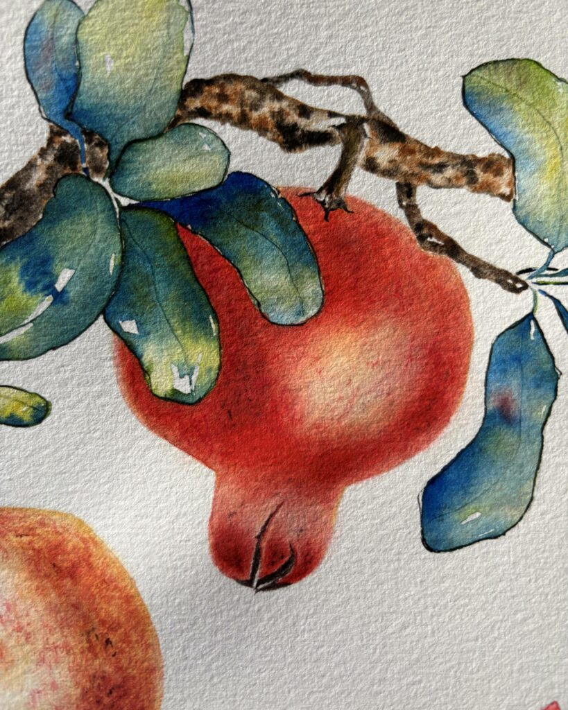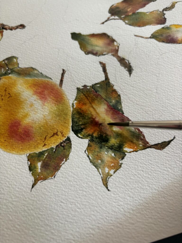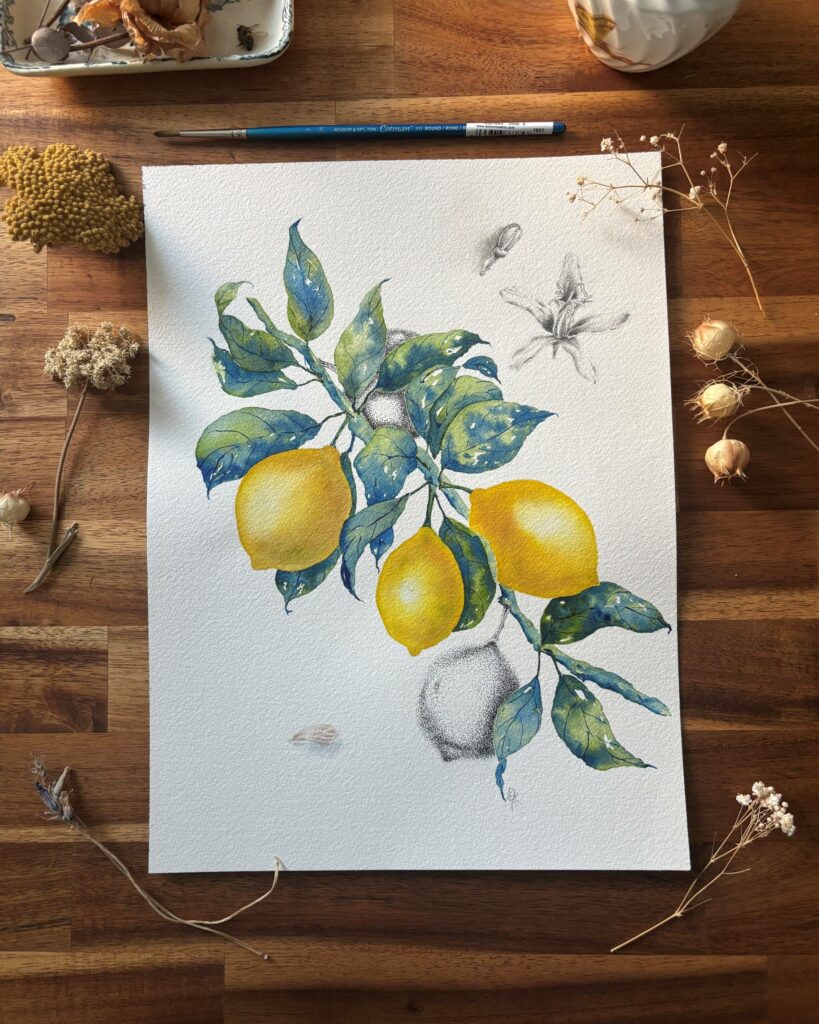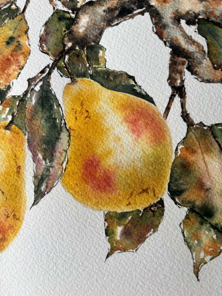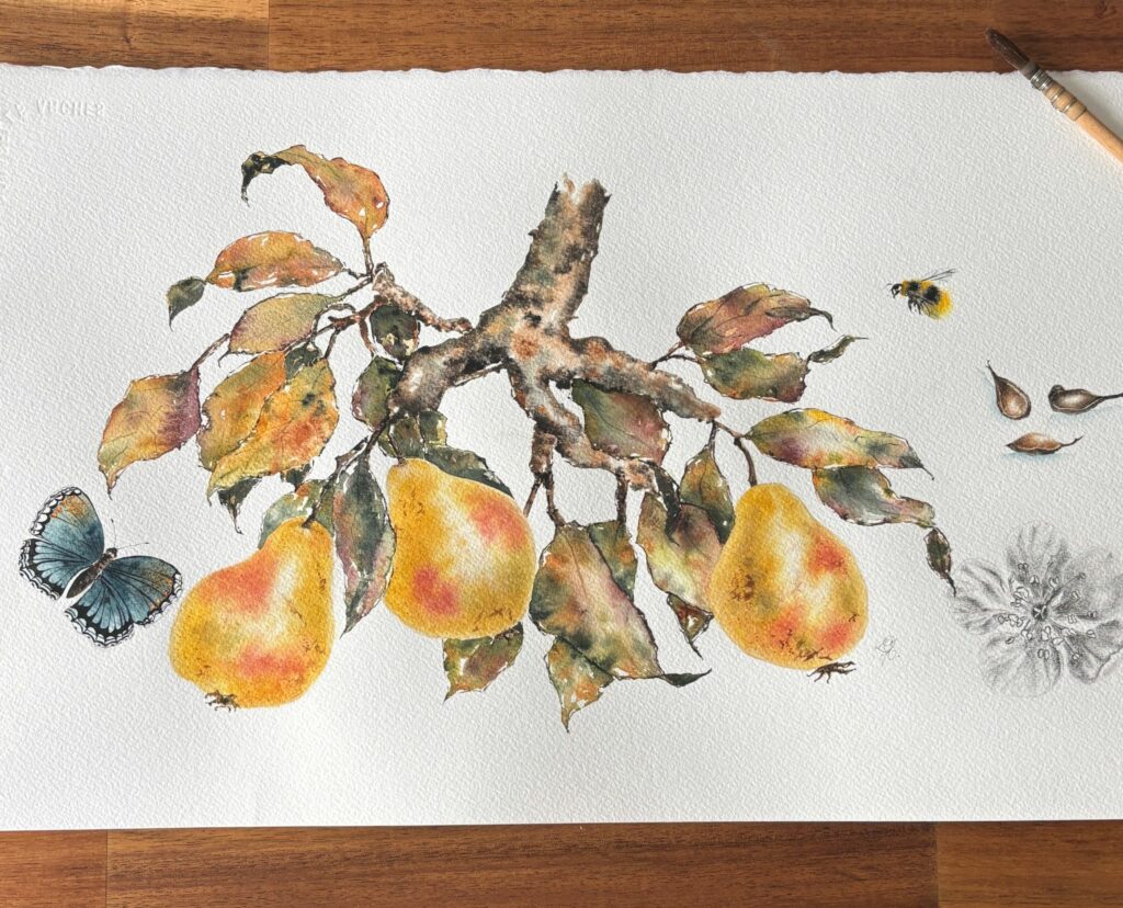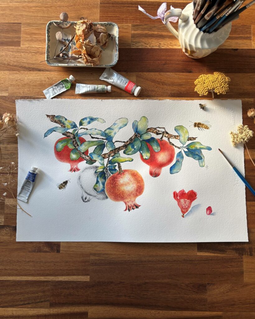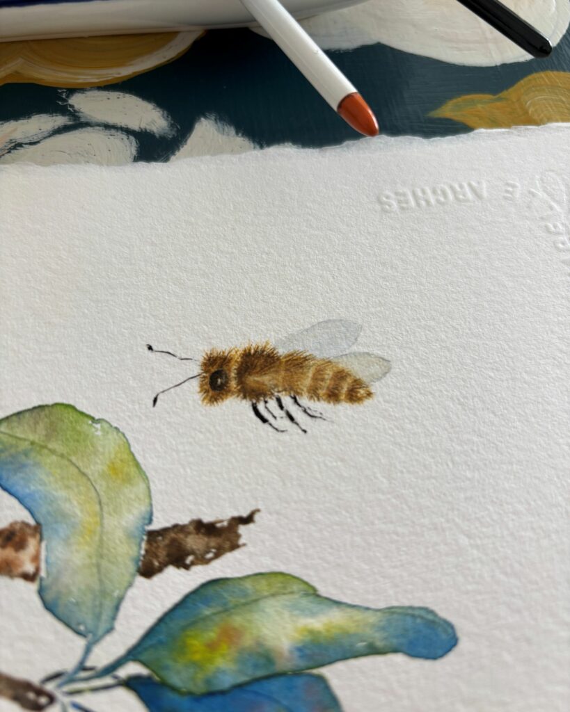 L’aquarelle est un médium qui me surprend encore, qui me permet d’obtenir des effets de matière absolument fascinants ! J’y vois comme un recueillement, un moment de méditation dans la fusion des couleurs que je laisse aller ou lorsque je peins une baie de Buisson ardent.