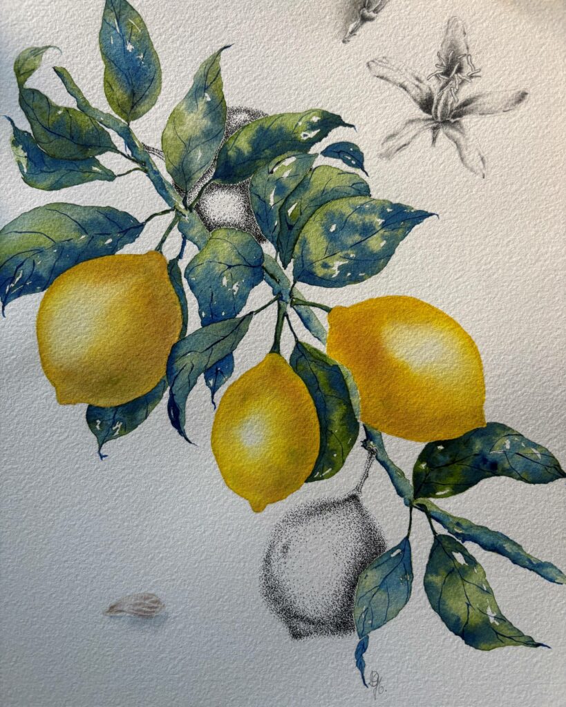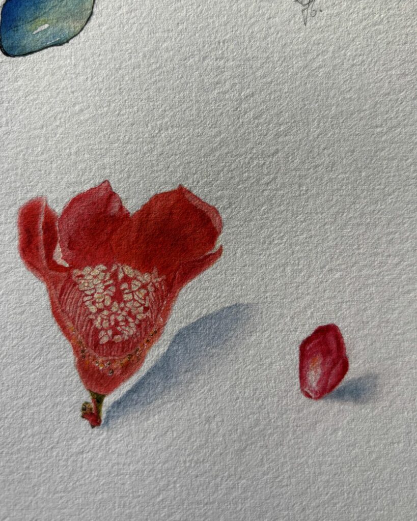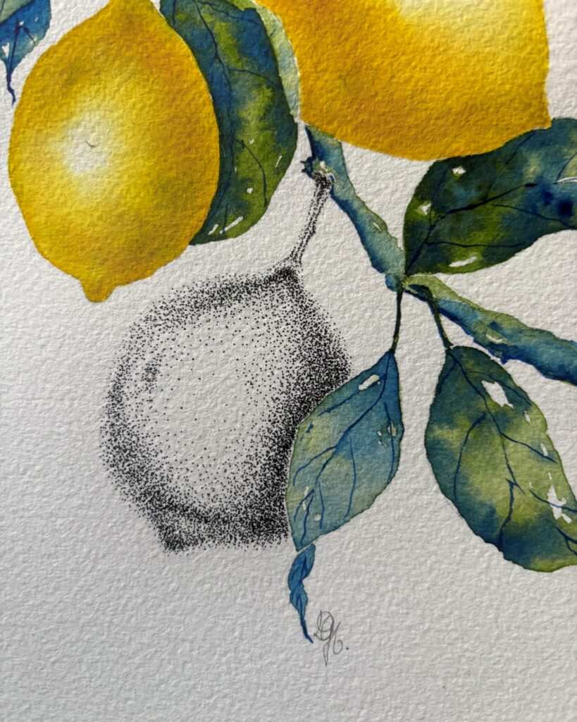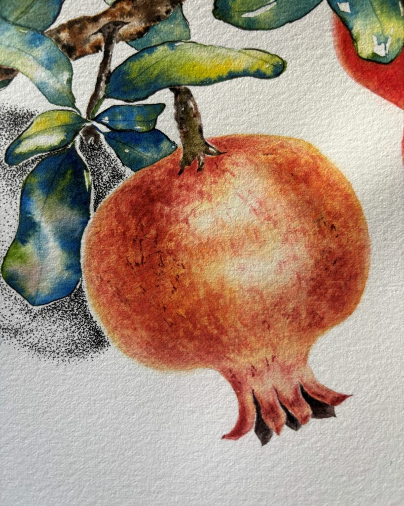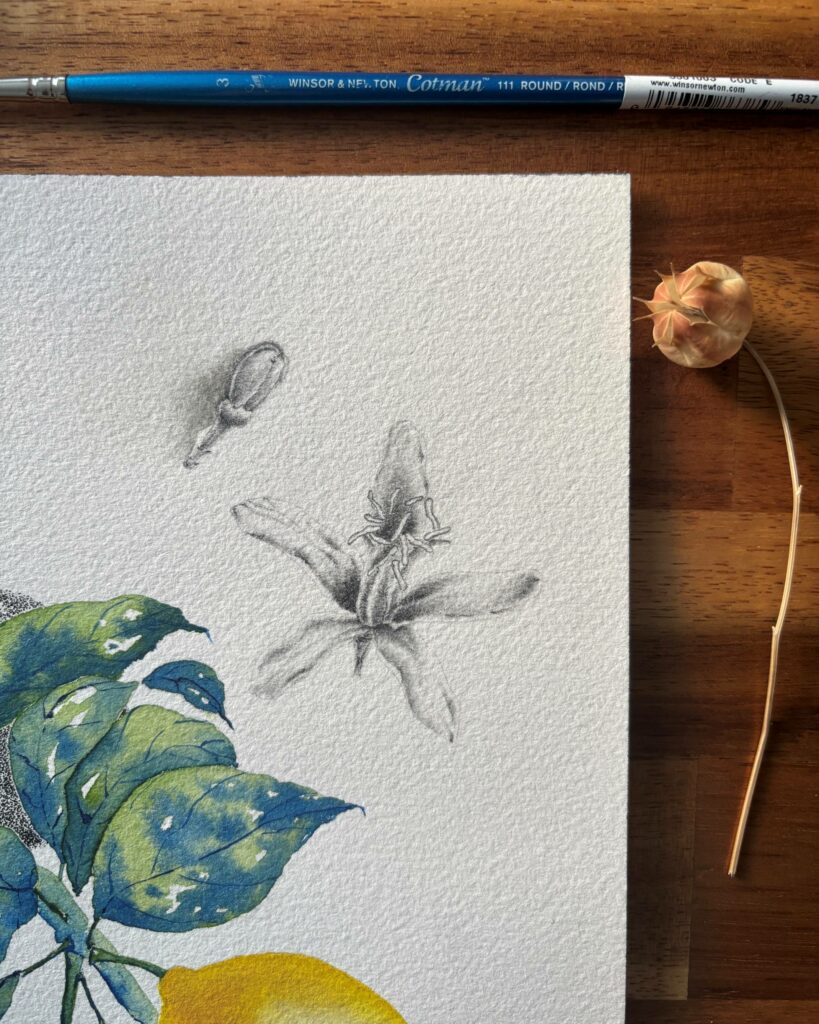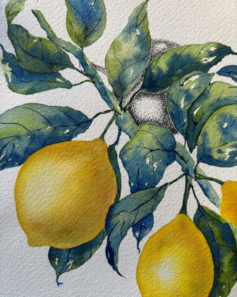 L’aquarelle est un médium qui me surprend encore, qui me permet d’obtenir des effets de matière absolument fascinants ! J’y vois comme un recueillement, un moment de méditation dans la fusion des couleurs que je laisse aller ou lorsque je peins une baie de Buisson ardent.