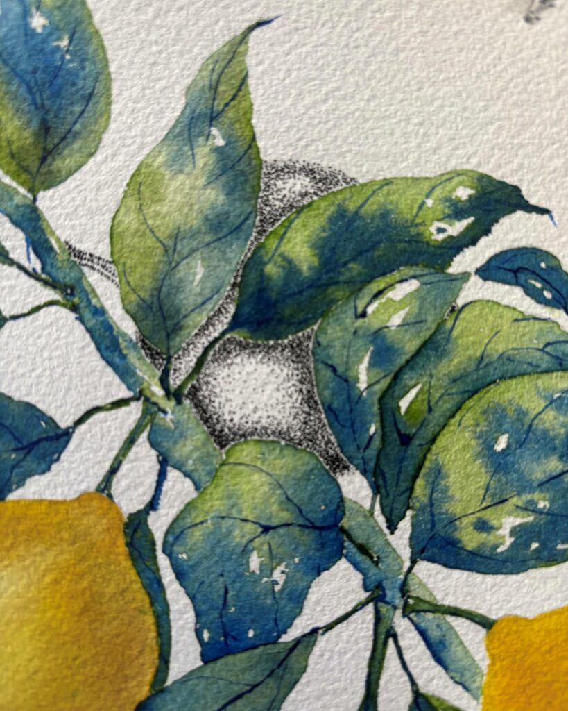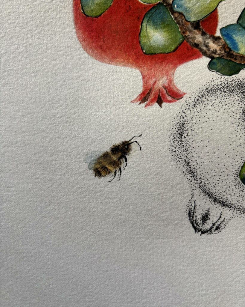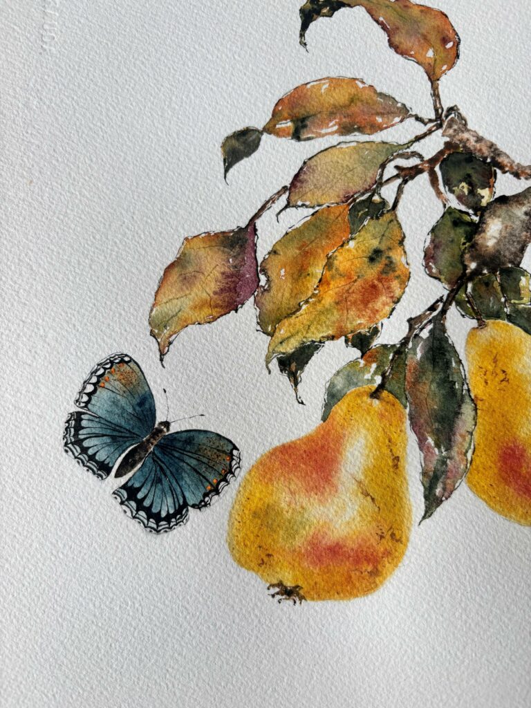 Pourquoi je vous parle de loupe ? Je peins le minuscule : insectes, plantes, baies, en mode un peu botanique. Rentre en compte un processus d’observation, être attentif aux détails et s’informer pour être juste. Et cela prend du temps.