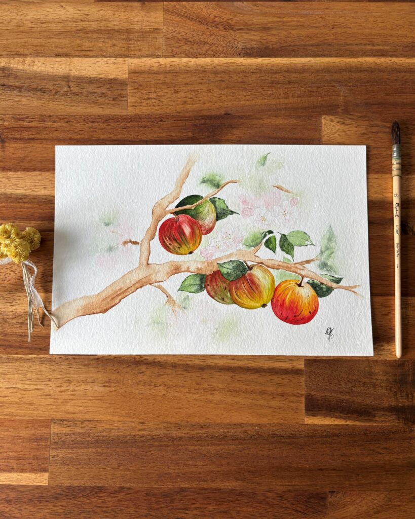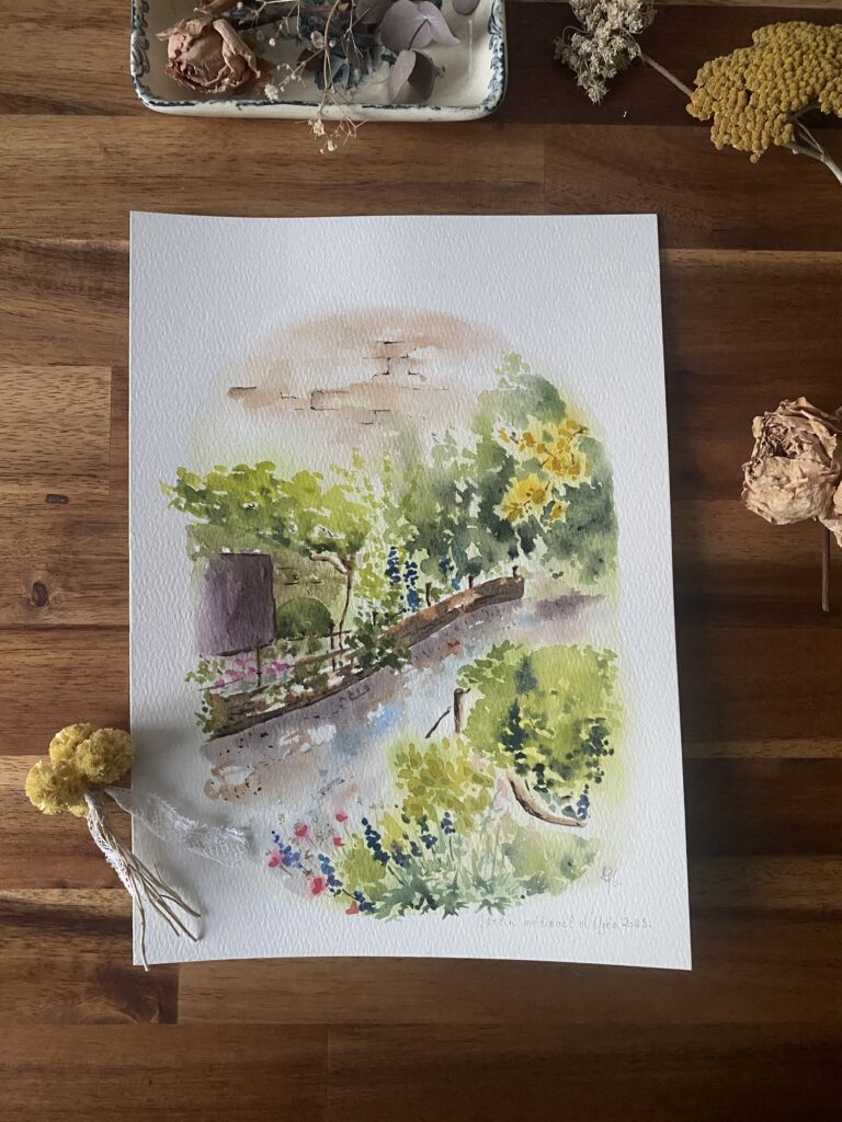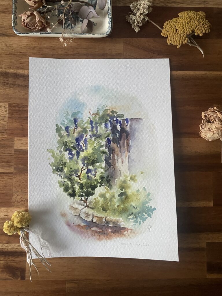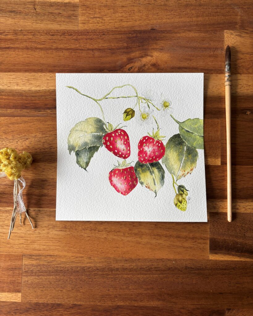 L’aquarelle est un médium qui me surprend encore, qui me permet d’obtenir des effets de matière absolument fascinants ! J’y vois comme un recueillement, un moment de méditation dans la fusion des couleurs que je laisse aller ou lorsque je peins une baie de Buisson ardent.