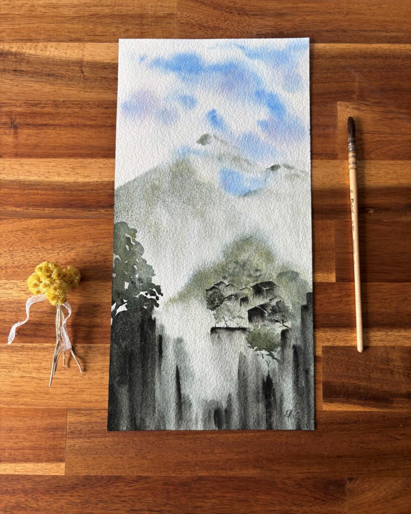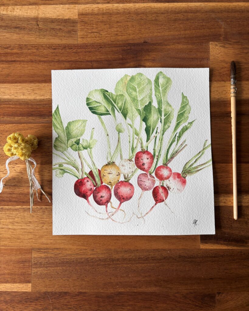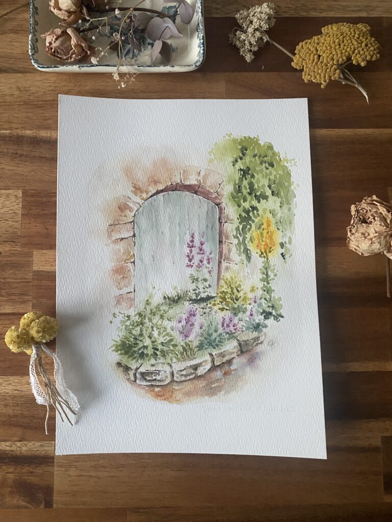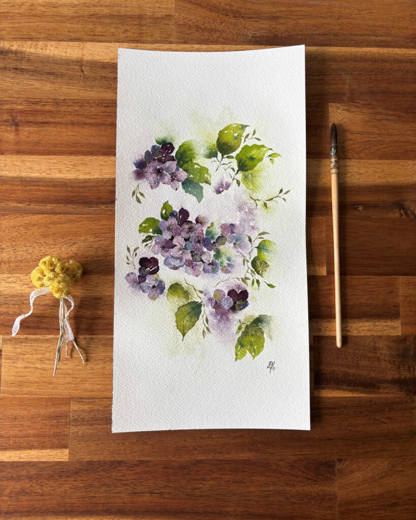 L’aquarelle est un médium qui me surprend encore, qui me permet d’obtenir des effets de matière absolument fascinants ! J’y vois comme un recueillement, un moment de méditation dans la fusion des couleurs que je laisse aller ou lorsque je peins une baie de Buisson ardent.