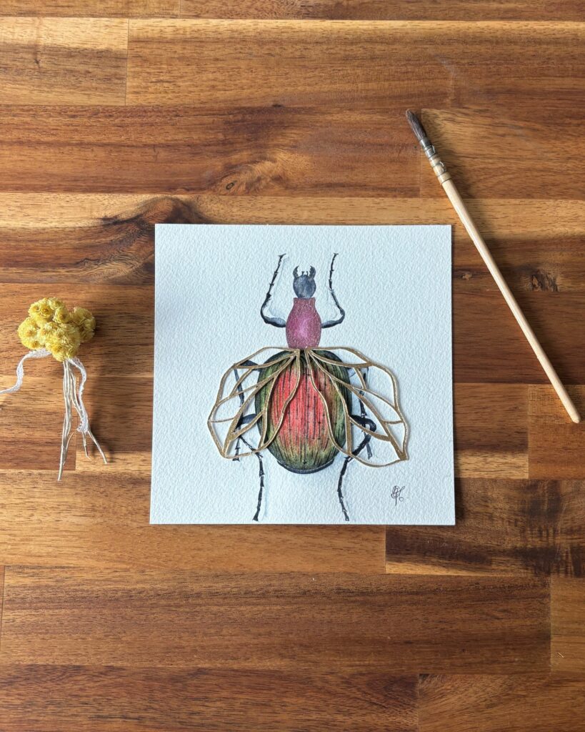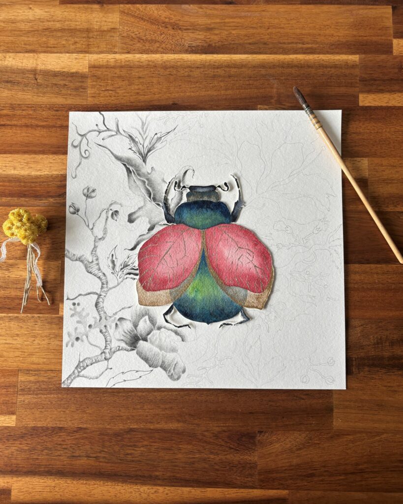 Pourquoi je vous parle de loupe ? Je peins le minuscule : insectes, plantes, baies, en mode un peu botanique. Rentre en compte un processus d’observation, être attentif aux détails et s’informer pour être juste. Et cela prend du temps.